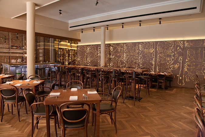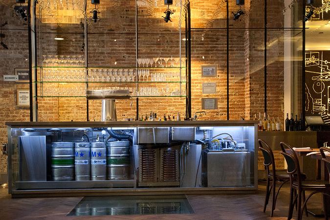 Hospoda features a brushed-steel frame glass bar that displays kegs of beer. A glass panel in the floor provides a view of wine and beer stored in the cellar. Black wooden panels along the walls are backlit to illuminate engraved graffiti. The 80-person-capacity Czech restaurant and bar is located on the ground floor of the New York City Landmark Bohemian National Hall. Project Profile Related Project: Magia Osteria Italiana